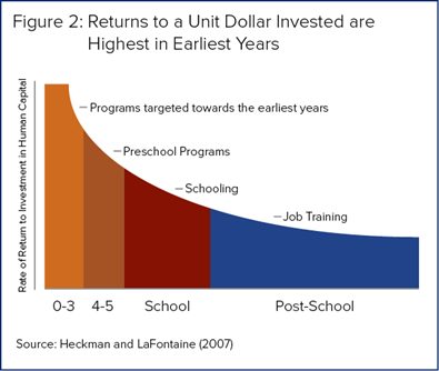 My earlier piece also mentioned the economist James Heckman, who developed the “Heckman curve” to illustrate the impact of investments at various life stages. (See the chart at top).